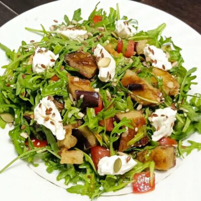 250гр. баклажан запечен., перец болг., фета, оливки, руккола, черри, соус