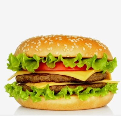 булочка,горчичный соус,кетчуп, лист салата,помидор, говяжья котлета 2 шт.,сыр 2 ломтика