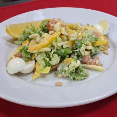 200гр. лосось слабосол., сельдерей, лист салата, перец болг., зел. яблоко, кедр.орехи, соус “Цезарь”