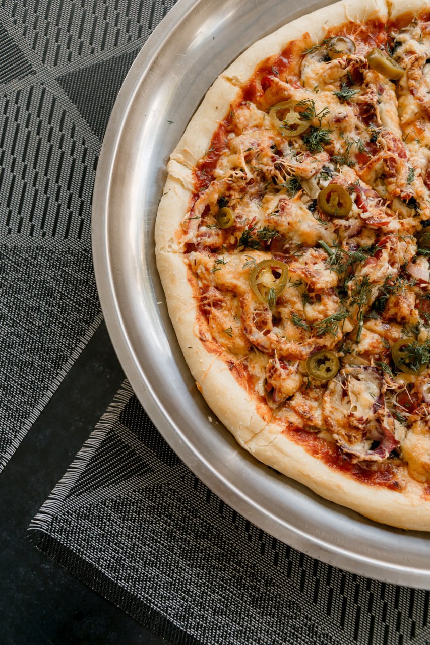 2 вида соуса, сыр, колбаски охотничьи, помидоры, грибы, перец острый маринованный, лук маринованный, зелень