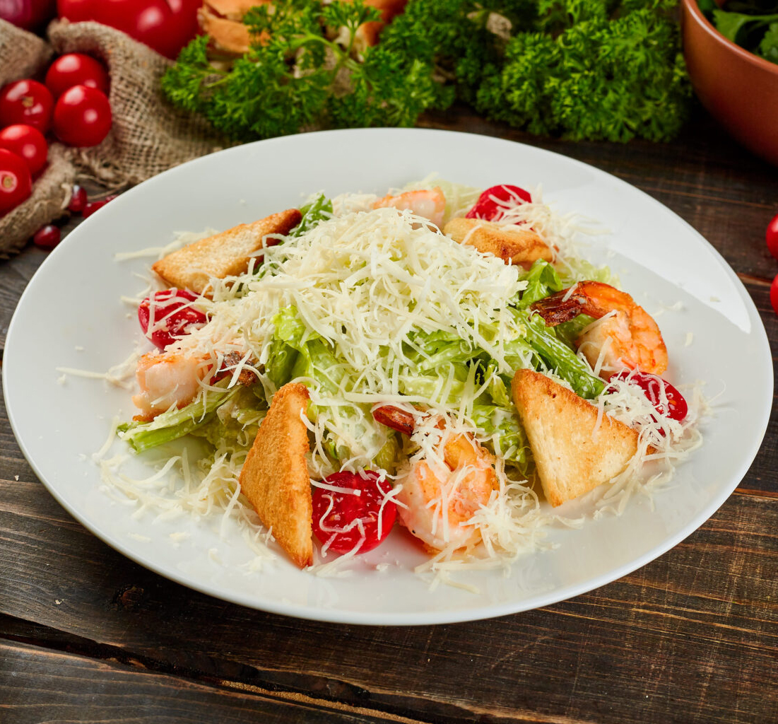 Хрустящие листья салата, сочные томаты черри, ароматный тертый сыр пармезан и нежнейшие наггетсы заправленные соусом Цезарь.