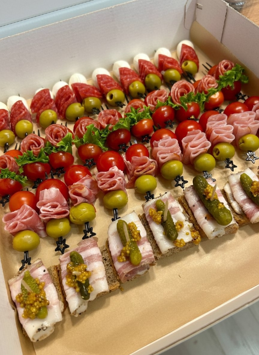 10 шт брускетты с вяленными помидорами,10 шт канапе с лососем.10 шт брускеттов с салом , 10 шпажек переппелиное яицо . колбаса, оливка. 10 шпажек колбаса, лист салата , помидор черри . 10 шпажек помидор черри ,сало , оливка