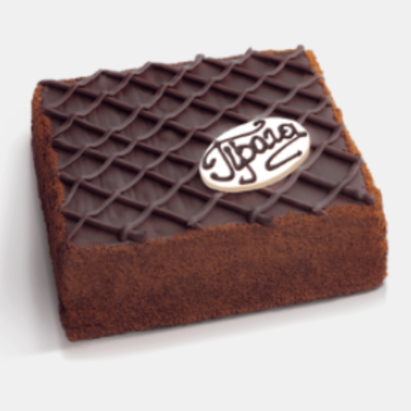 Шоколадные бисквитные коржи переслоены двумя видами крема: сливочным с арахисовой пастой и карамельным с жареным арахисом. Верхний корж торта покрыт глазурью и декорирован арахисом.