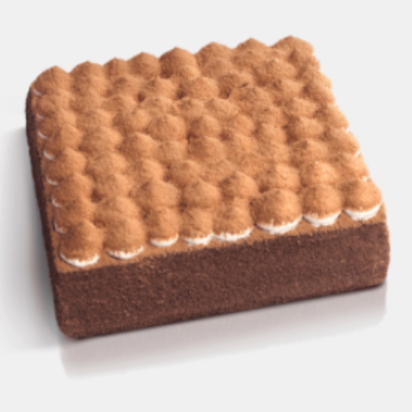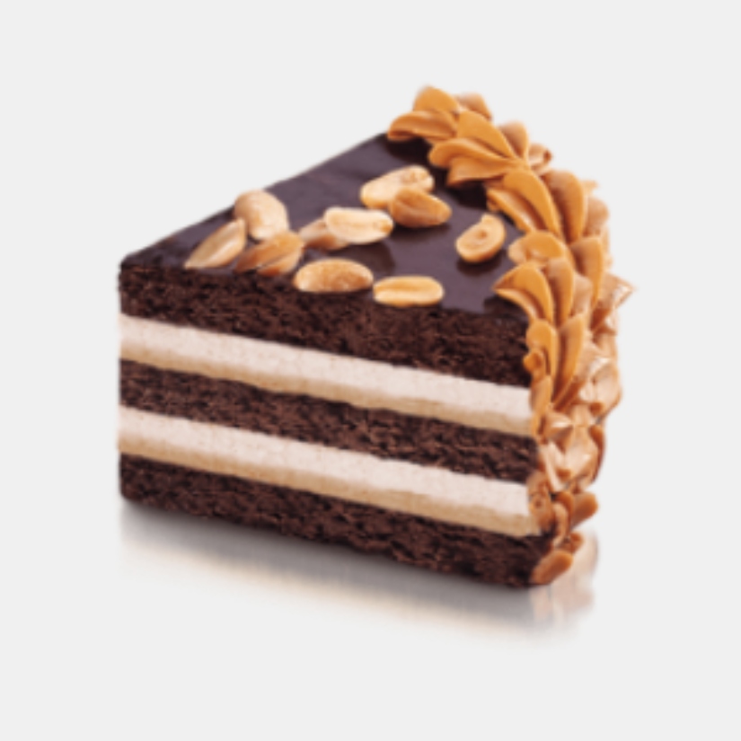 Шоколадные бисквитные коржи переслоены двумя видами крема: сливочным с арахисовой пастой и карамельным с жареным арахисом. Верхний корж торта покрыт глазурью и декорирован арахисом.