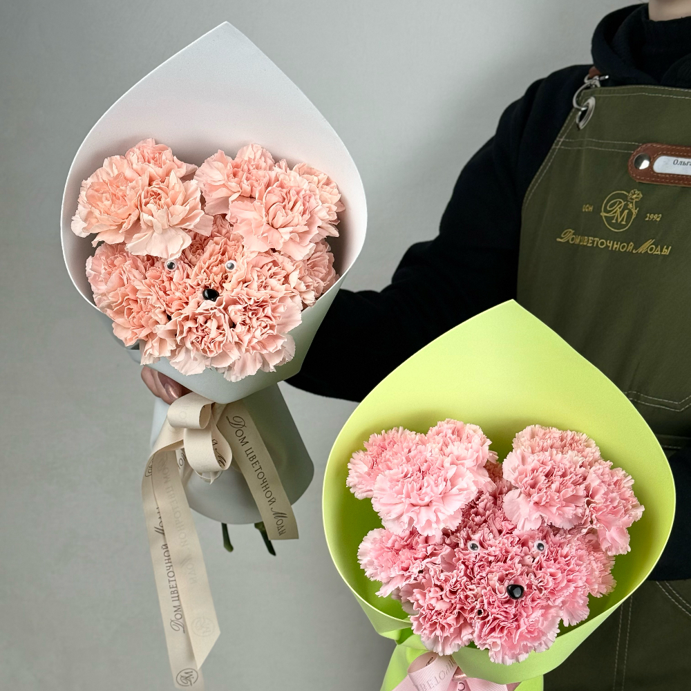 Детский букет в форме милой мордочки из розовых и персиковых гвоздик