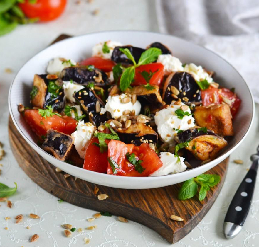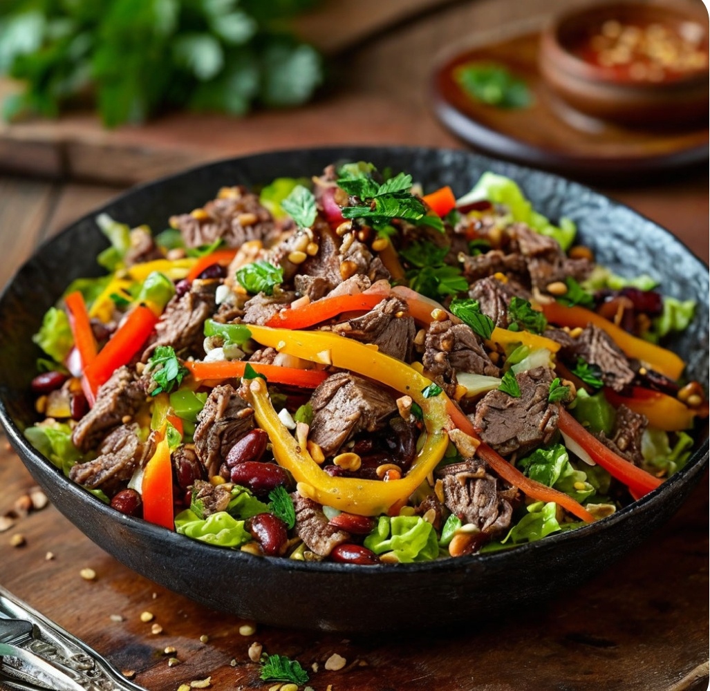 лист салата, нежная говяди | Больше лист салата, нежная говядина, сладкий перец, жареный баклажан, сыр Фета, соевый соус, кунжут, оливковое масло, 250г| Скрыть