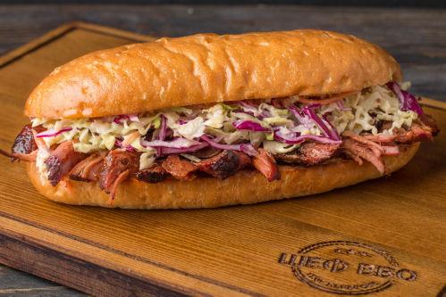 французский багет, марино | Больше французский багет, маринованный огурец, колбаска говяжья, соус горчичный, соус томатный| СкрытьБургер