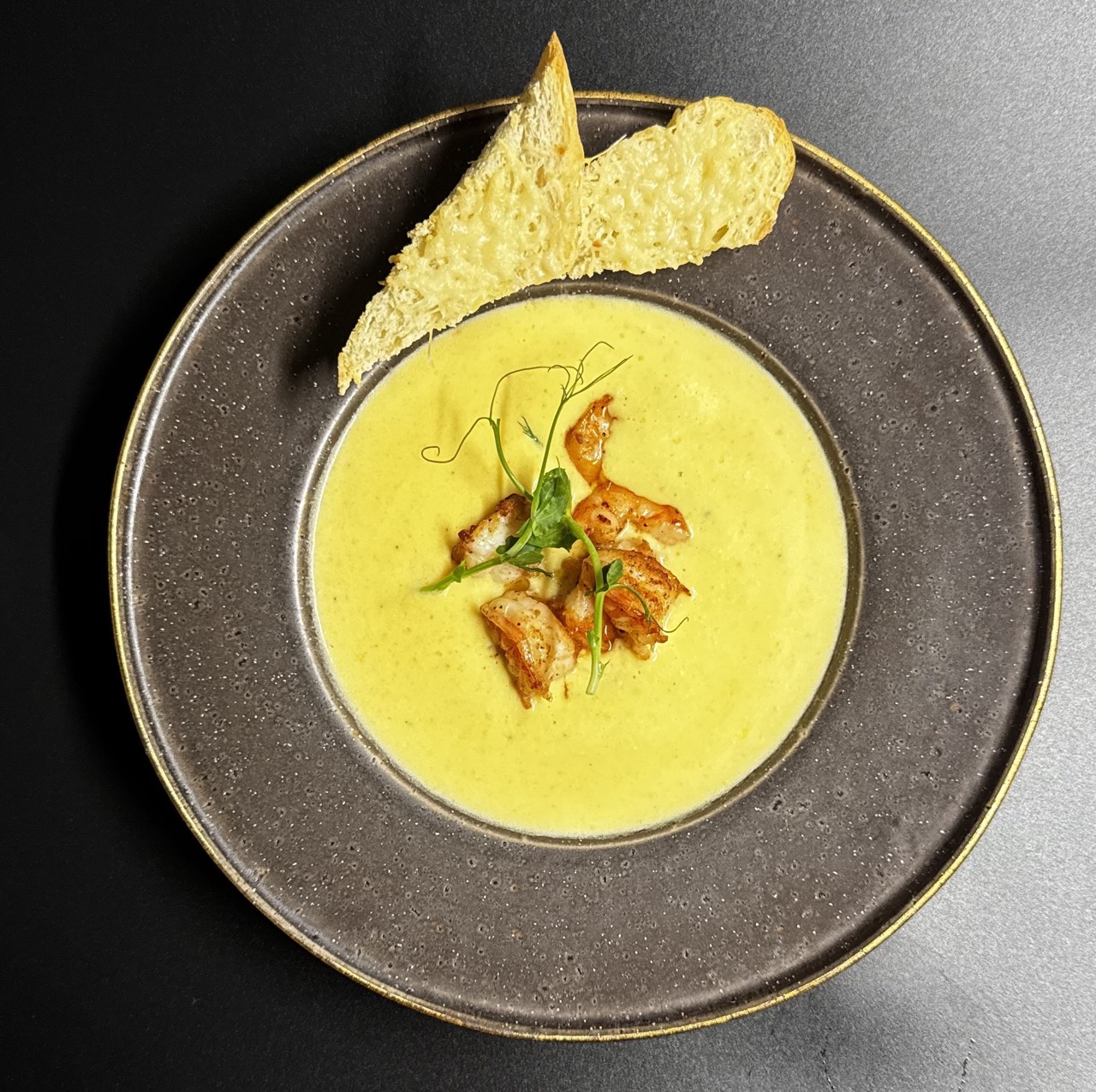 Крем-суп на основе куриног | Больше Крем-суп на основе куриного бульона, сыра Чеддер, пармезана, дор-блю, сливок, с обжаренными креветками и тостом из чиабатты с пармезаном. | Скрыть