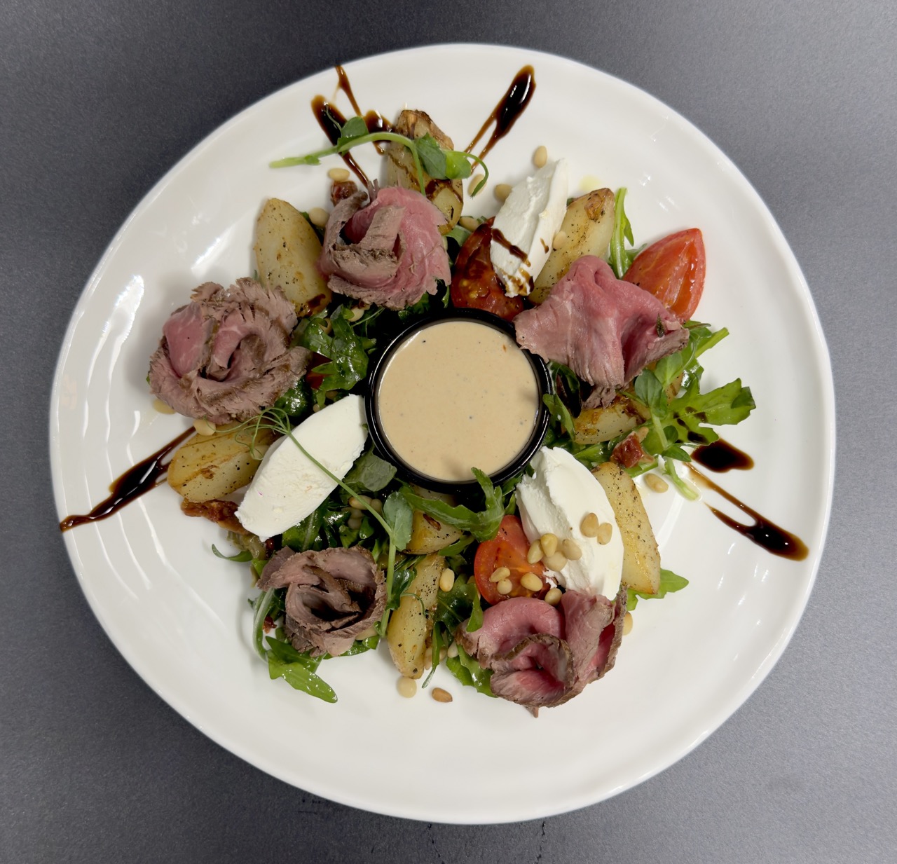 Ростбиф, руккола, соус "вит | Больше Ростбиф, руккола, соус "вителло-тонато", томаты черри, вяленые томаты, творожный сыр, каперсы | Скрыть