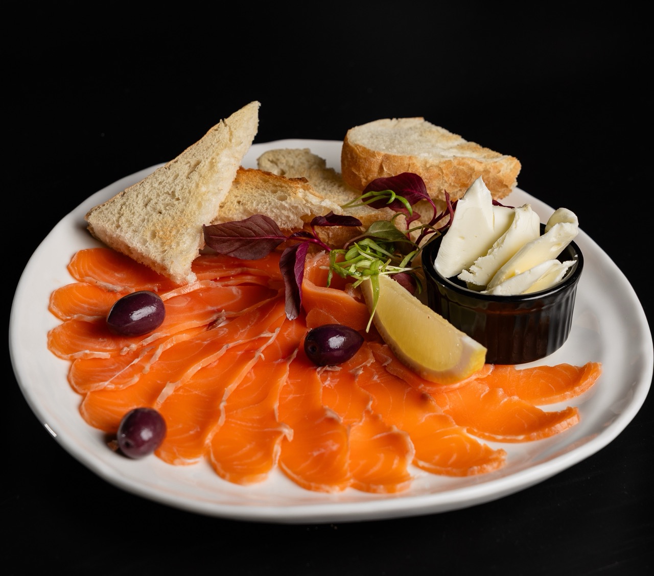 Тонкие слайсы лосося собс | Больше Тонкие слайсы лосося собственной засолки, чиабатта, лимон, сливочное масло| Скрыть
