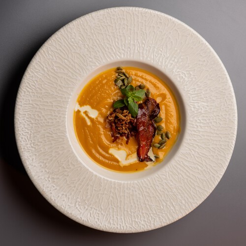 Крем суп из обжаренной тык | Больше Крем суп из обжаренной тыквы с овощами (лук репчатый, чеснок), со сливками, с добавлением кокосового молока, лук фри, куркума, подается с обжаренным беконом, тыквенными семечками и гренками| Скрыть