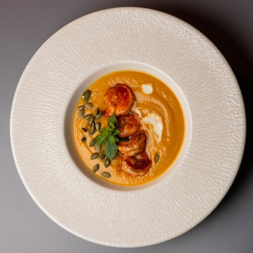 Крем суп из обжаренной тык | Больше Крем суп из обжаренной тыквы с овощами (лук репчатый, чеснок), со сливками, с соусом ким-чи, тыквенными семечками, паприкой, с добавлением кокосового молока, подаются с обжаренными креветками и гренками| Скрыть