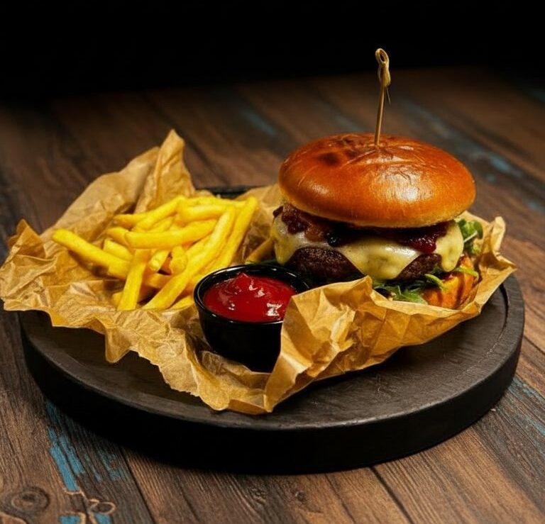 Булочка бриошь, котлета со | Больше Булочка бриошь, котлета собственного приготовления из говядины PrimeBeef, моцарелла в панировке, обжаренная во фритюре, руккола, соус брусничный с красным луком и вином, майонез, кетчуп, картофель фри. 600гр/50гр| Скрыть