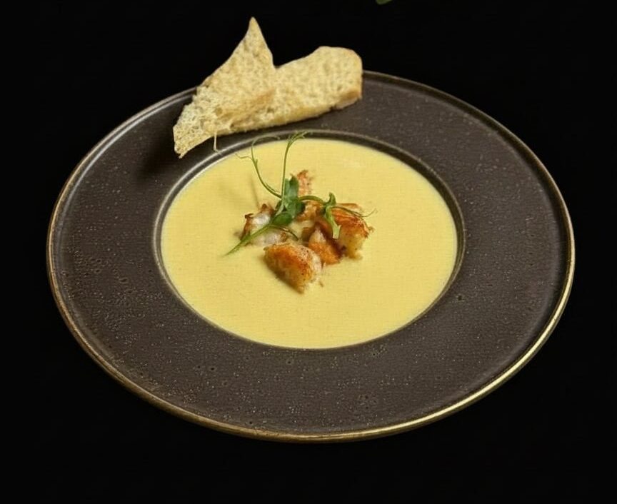Крем-суп на основе куриног | Больше Крем-суп на основе куриного бульона, сыра Чеддер, пармезана, дор-блю, сливок, с обжаренными креветками и тостом из чиабатты с пармезаном.| Скрыть