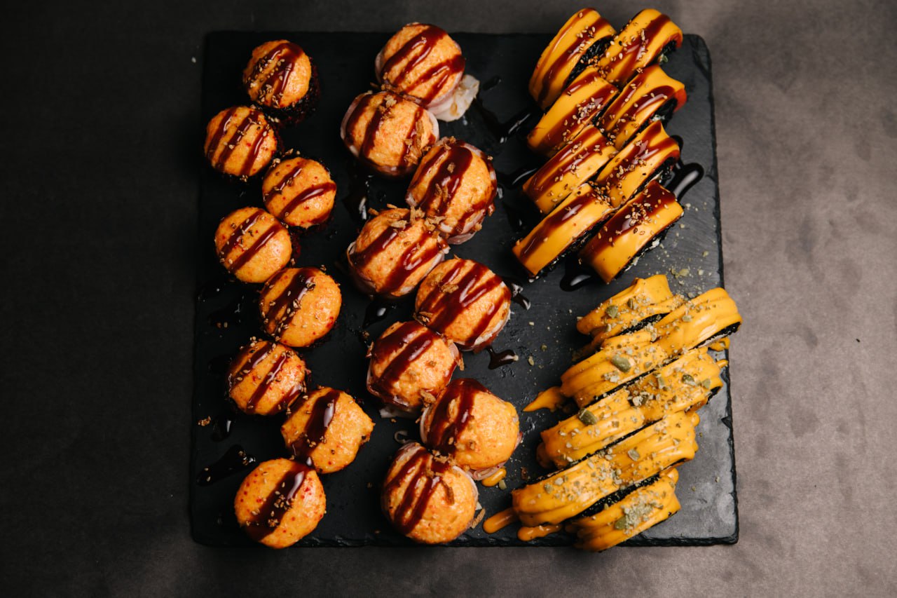 Рис, водоросли нори, сыр фи | Больше Рис, водоросли нори, сыр филадельфия, креветки, огурец, икра масаго, манго-чили соус, сырная лава| СкрытьПицца