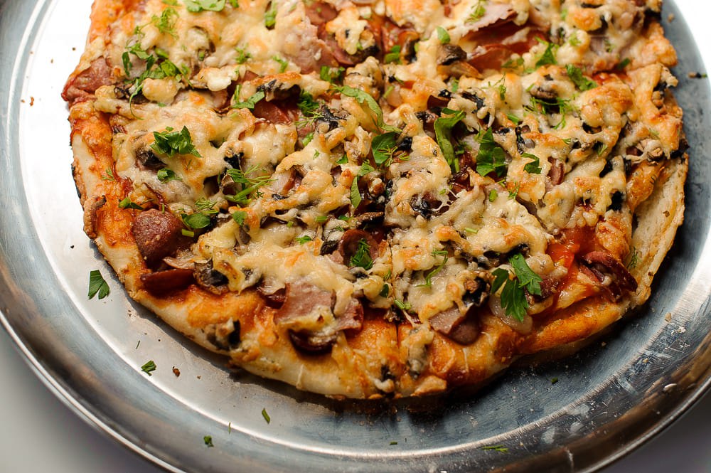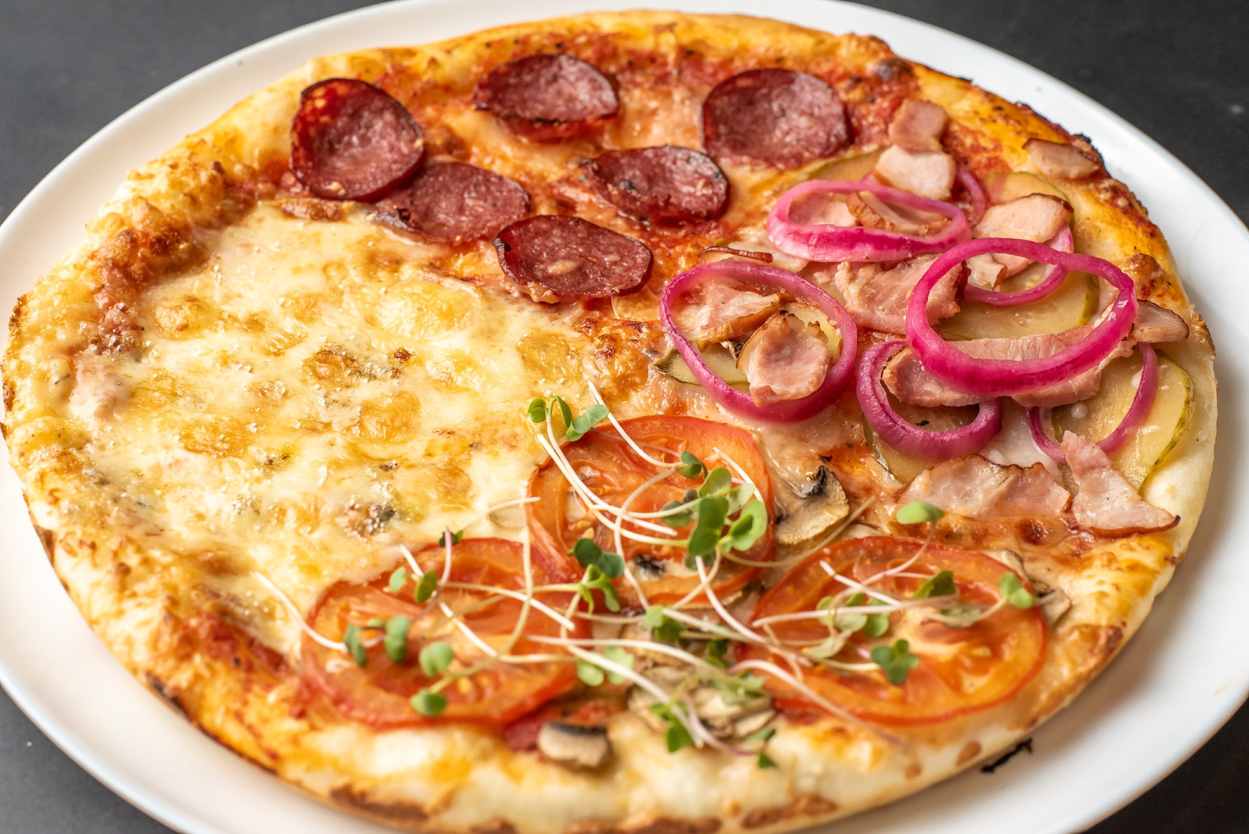 Соус из протертых томато | Больше Соус из протертых томатов, сыр моцарелла, салями, бекон, огурцы маринованные, лук красный , помидоры, грибы, сыр дор блю, сыр пармезан, сыр российский | Скрыть