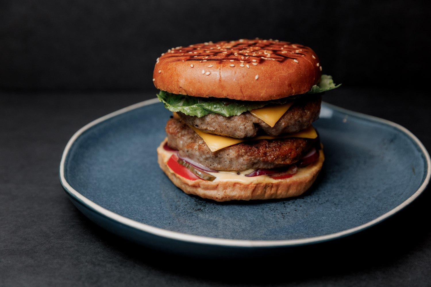 Свиная котлета, огурцы мар | Больше Свиная котлета, огурцы маринованые, двойной сыр чеддер, карамелизированный лук , соус для бургеров , помидор| Скрыть