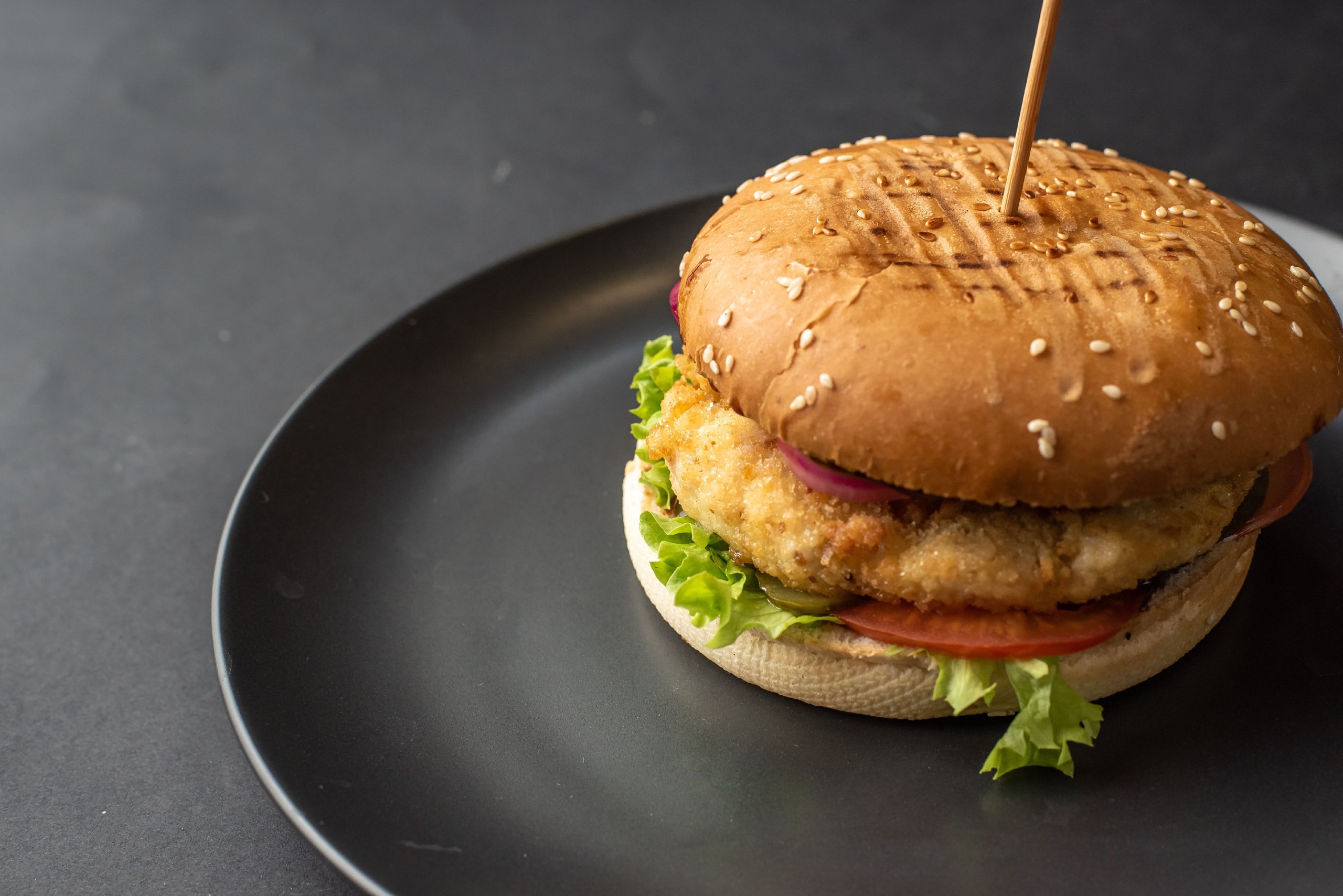 Бургер с курицей фри, крас | Больше Бургер с курицей фри, красный лук, соусом для бургеров ,томатным соусом, помидорами, огурцами маринованными, листом салата.| Скрыть