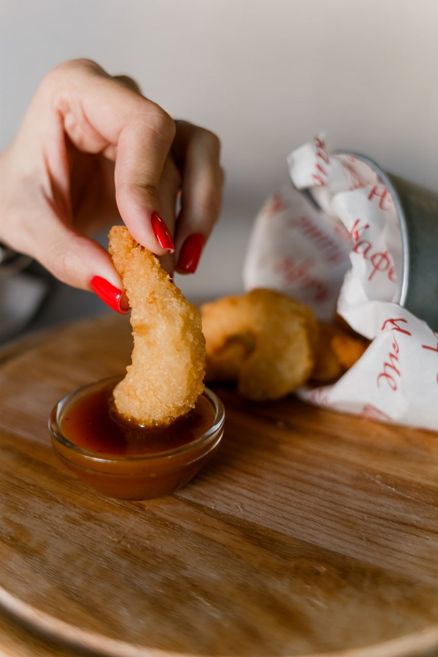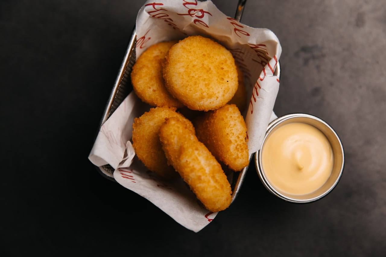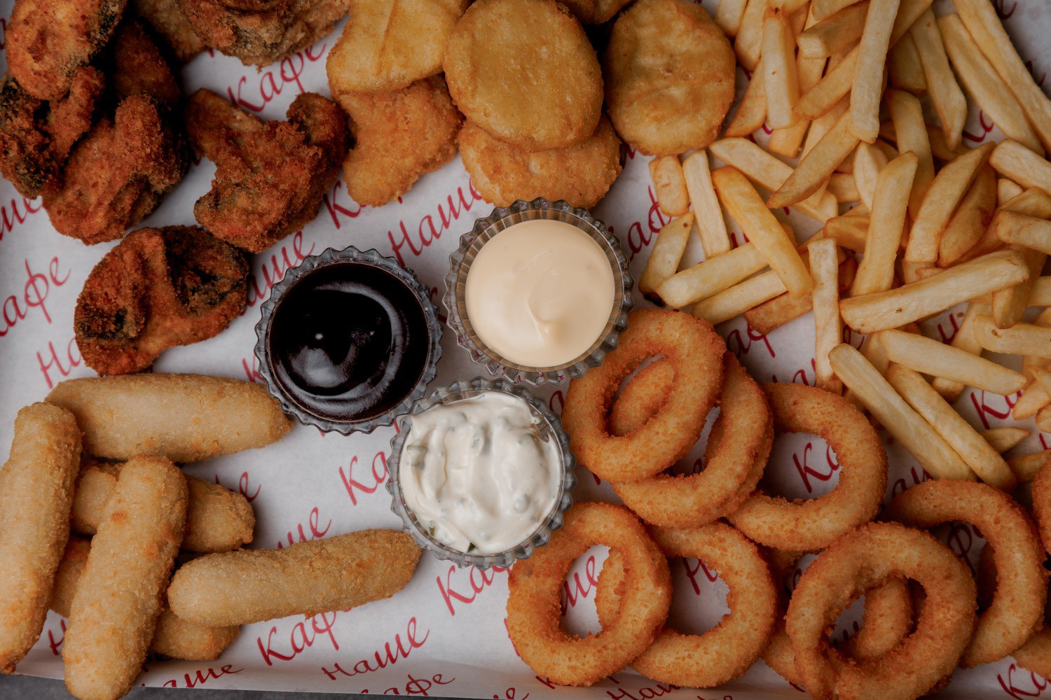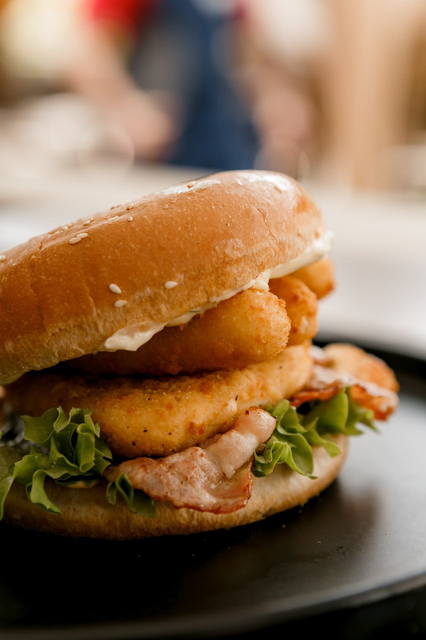 Куриная котлета , лист сал | Больше Куриная котлета , лист салата, бекон, сырные палочки, лук карамелизированный, соус для бургеров и ягодный соус| Скрыть