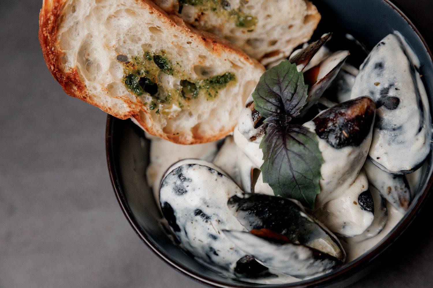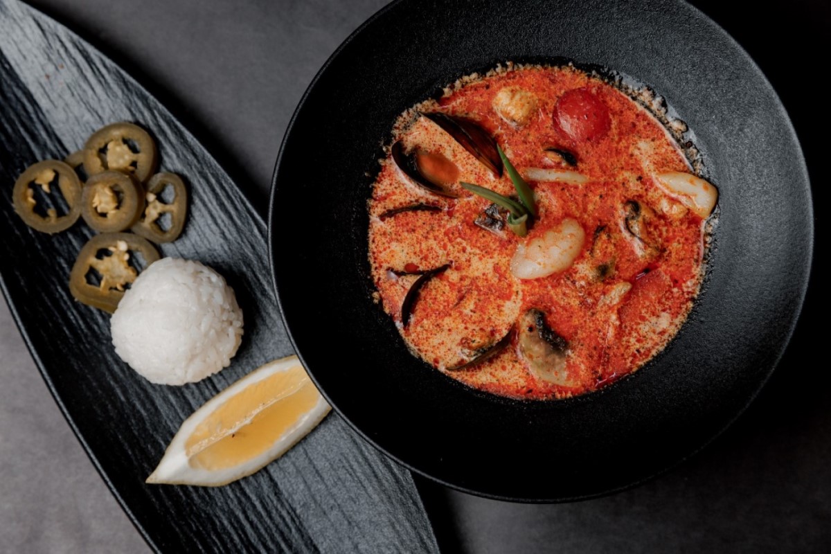Сливочный соус, паста Том | Больше Сливочный соус, паста Том Ям, кальмар, креветка, мидии, сыр моцарелла, помидор, перец халапеньо, соус песто, лимон| Скрыть