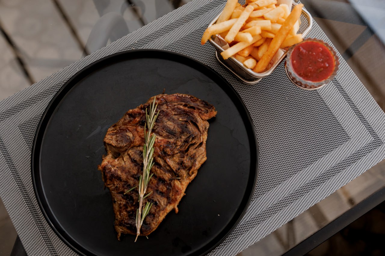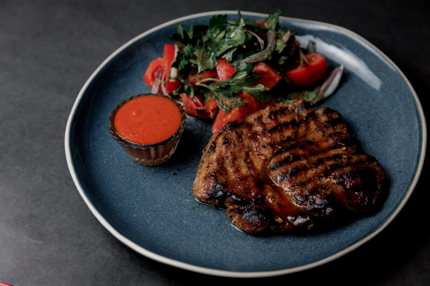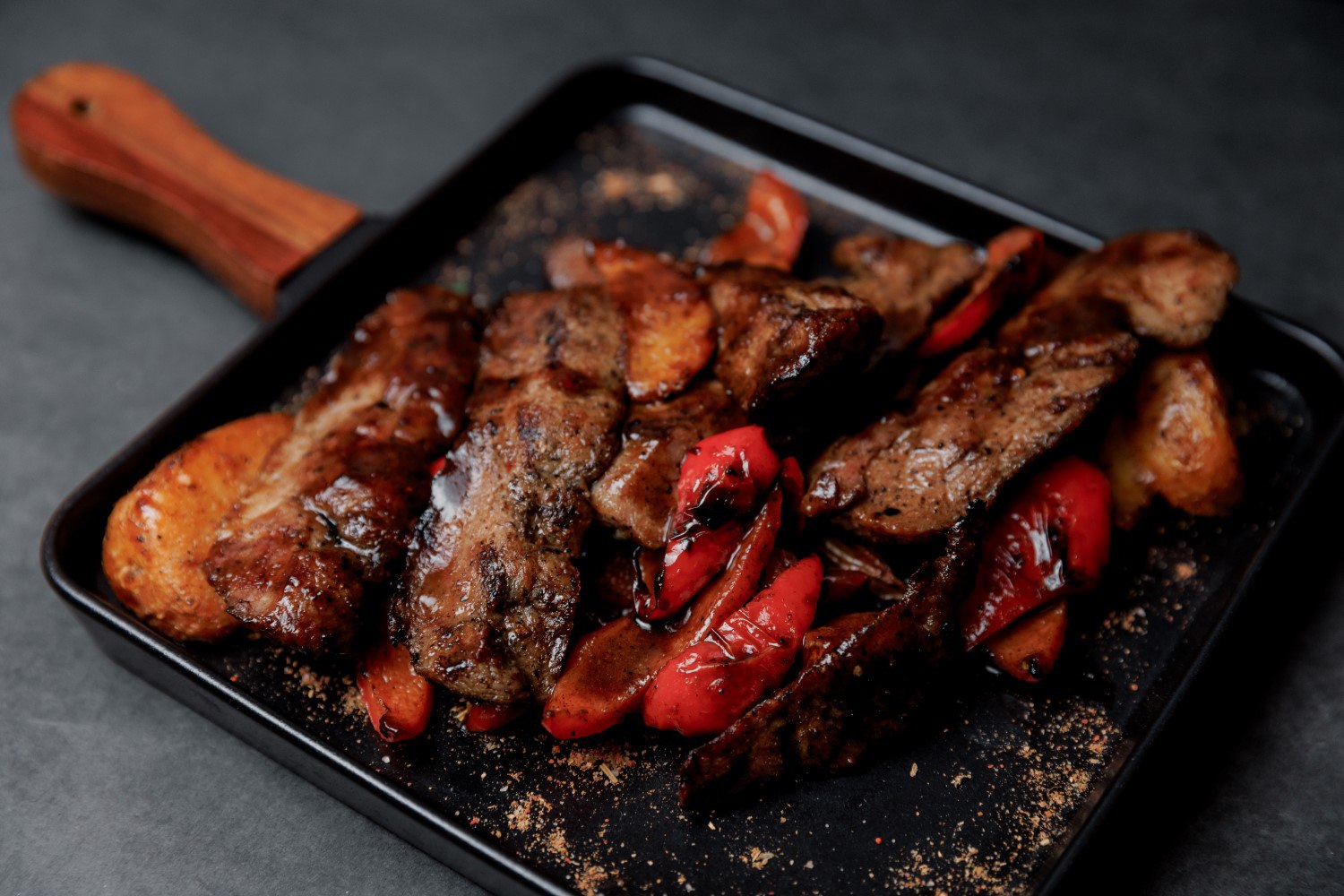 Стейк из свинины в соусе bla | Больше Стейк из свинины в соусе black pepper, с картофельными дольками, обжаренными грибами и маринованными огурцами| Скрыть