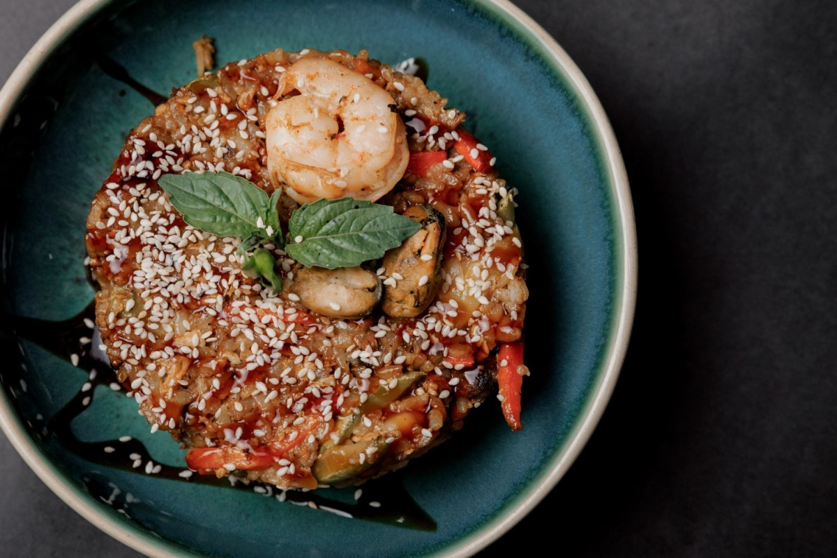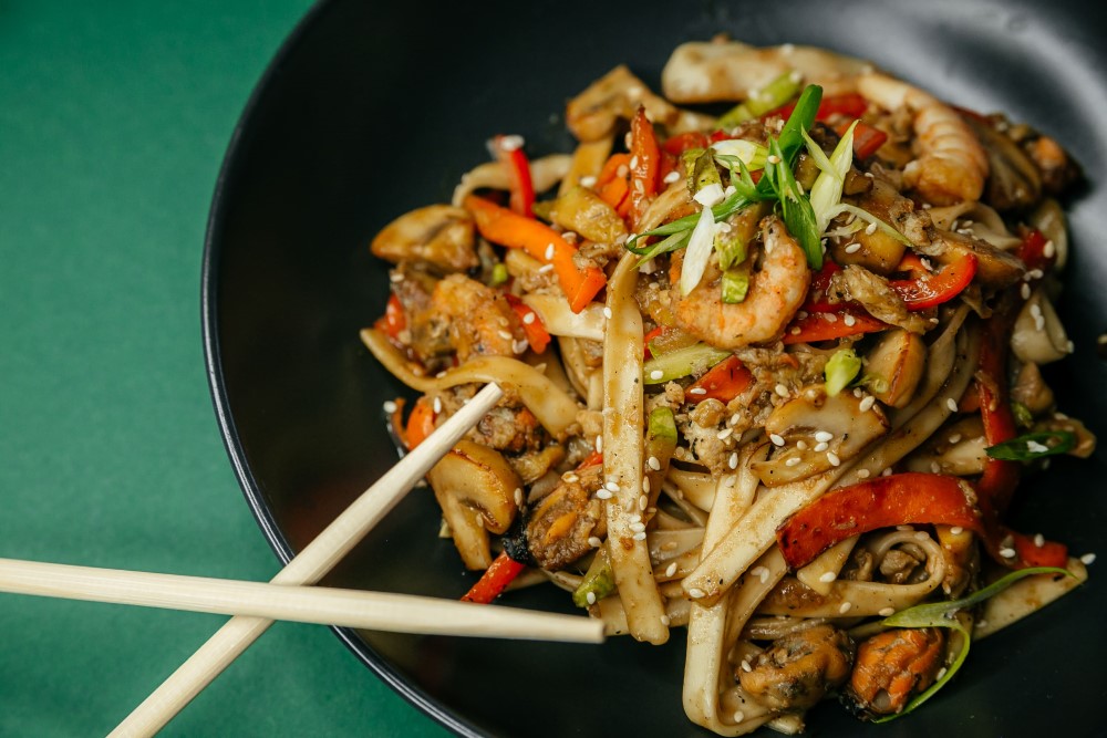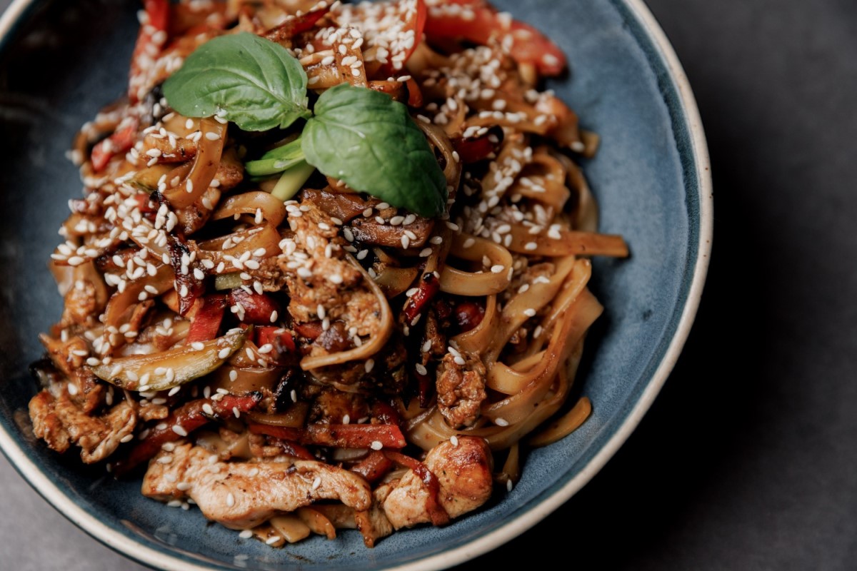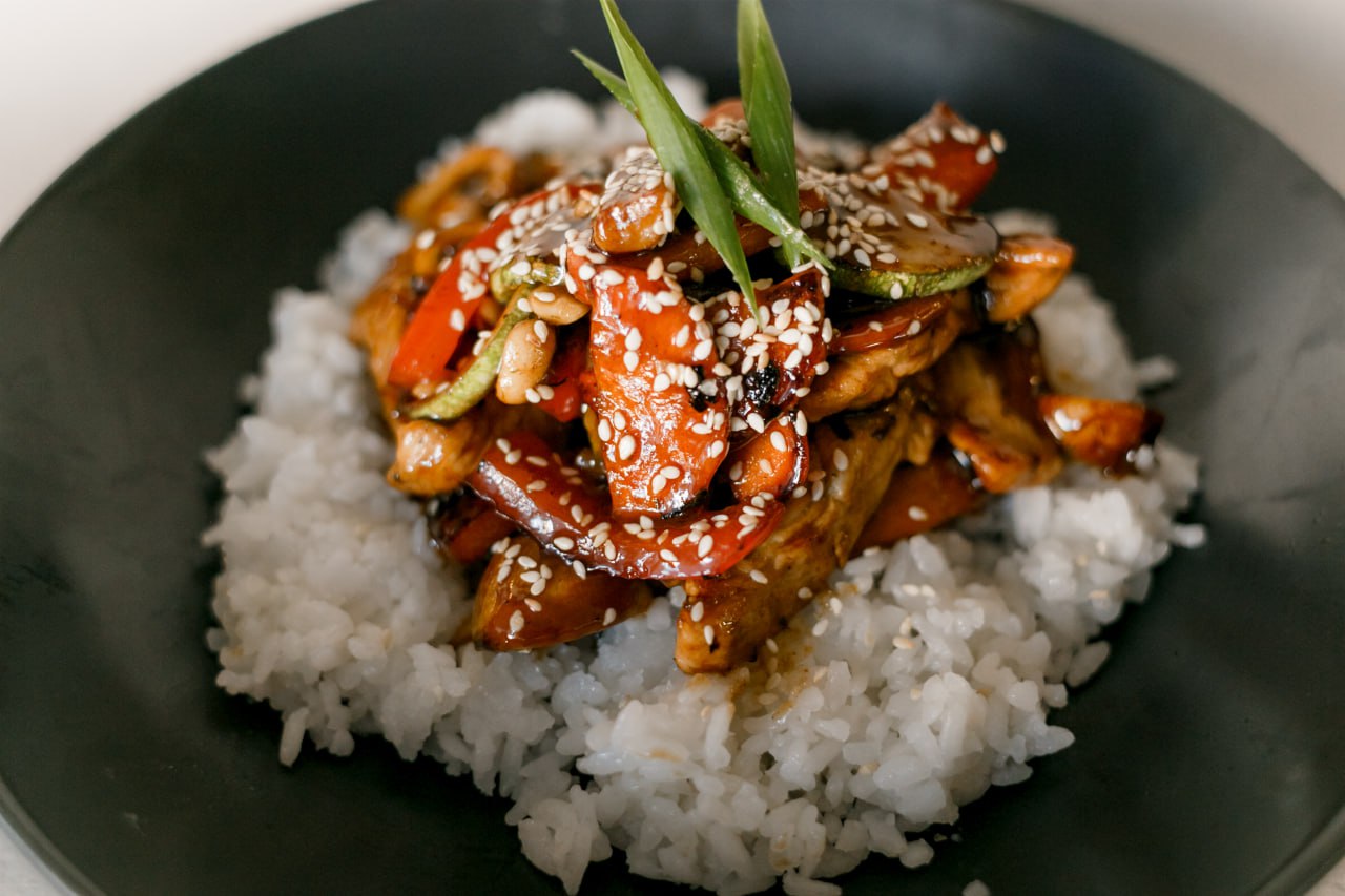 куриное филе, рис, морковь, | Больше куриное филе, рис, морковь, цукини, паприка, грибы, корень имбиря, кунжут, арахис, лук зеленый, соус терияки| Скрыть