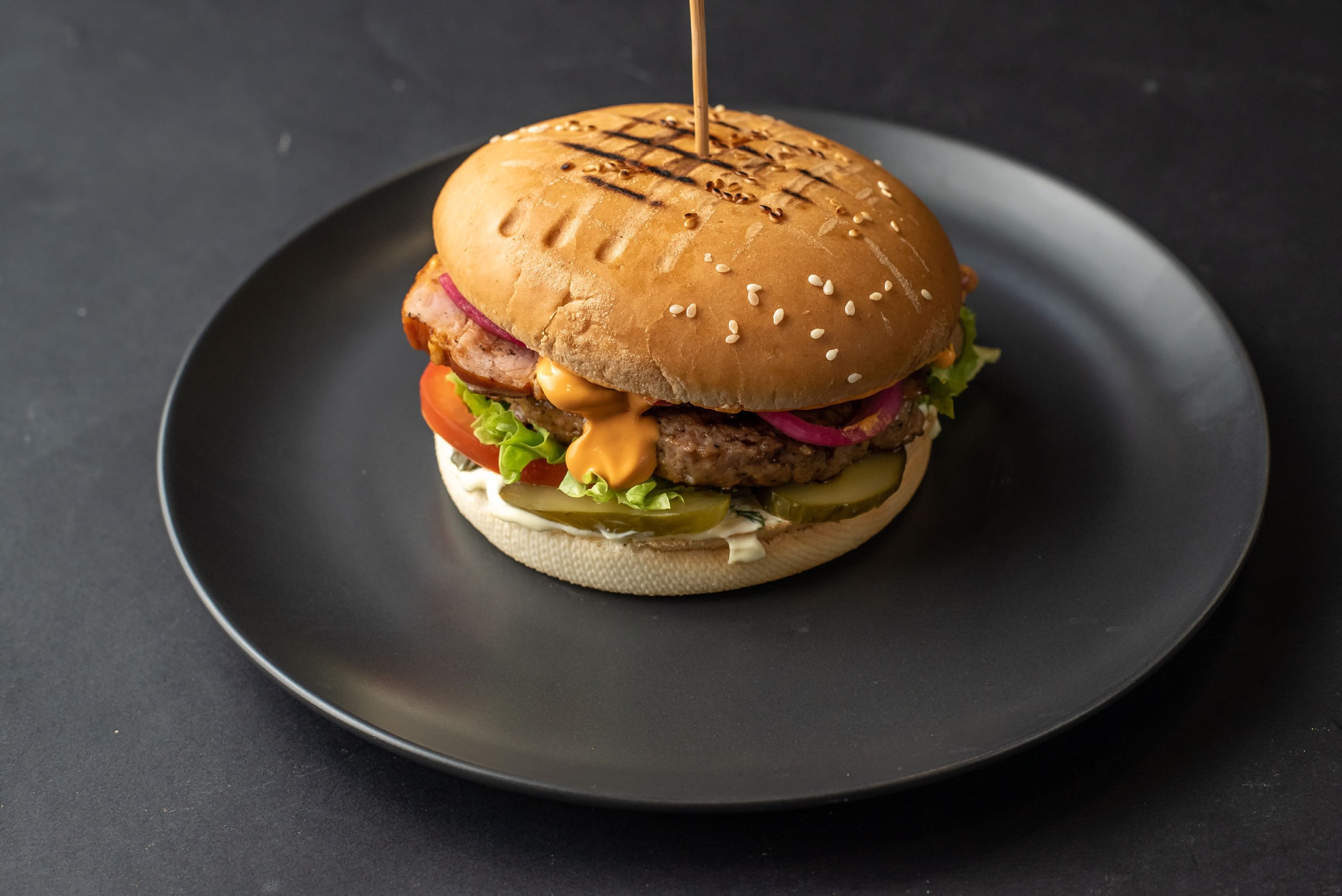 бургер с классической сви | Больше бургер с классической свиной котлетой, с беконом, помидорами, листом салата, огурцами маринованными, соусом бургер, чесночным соусом и красным луком| Скрыть