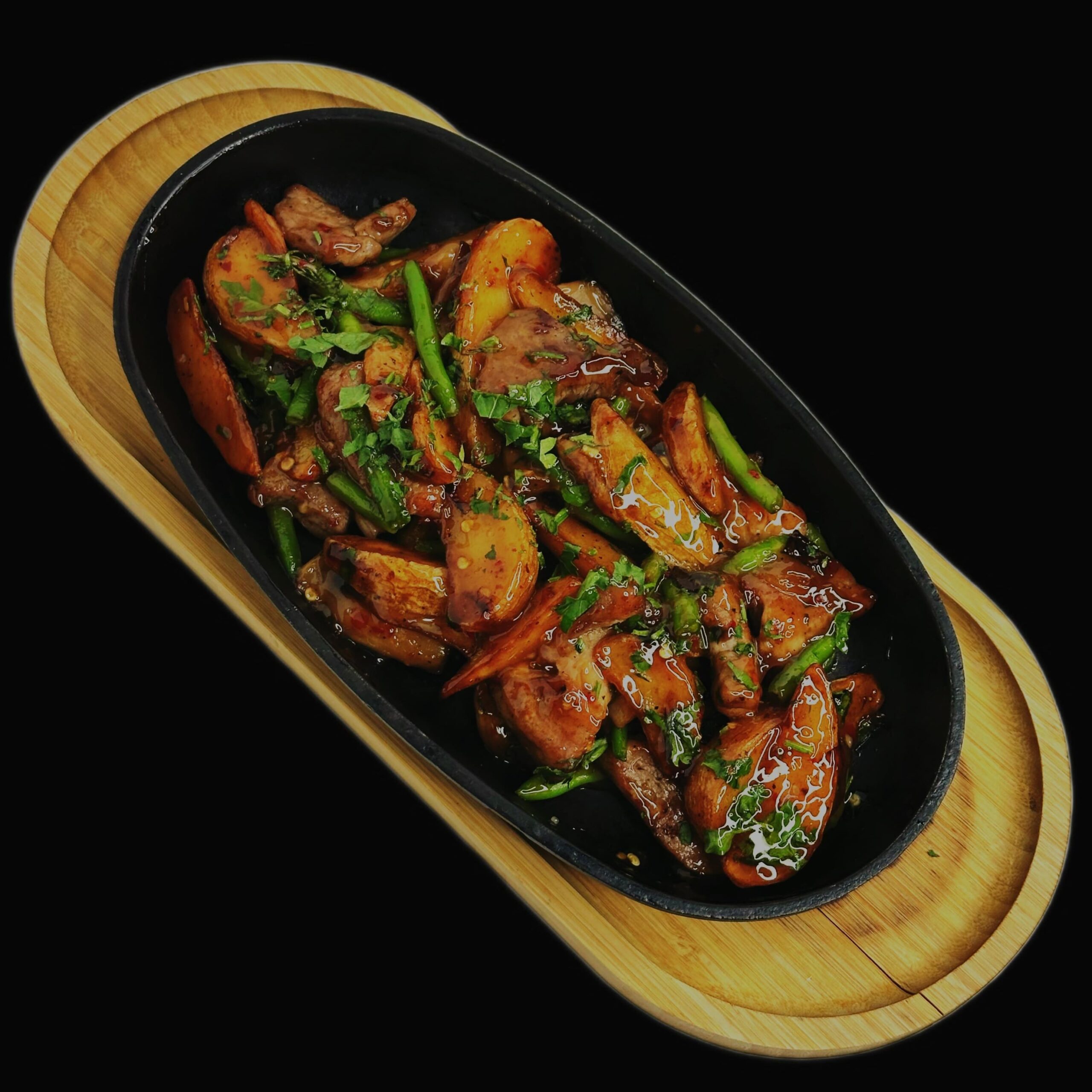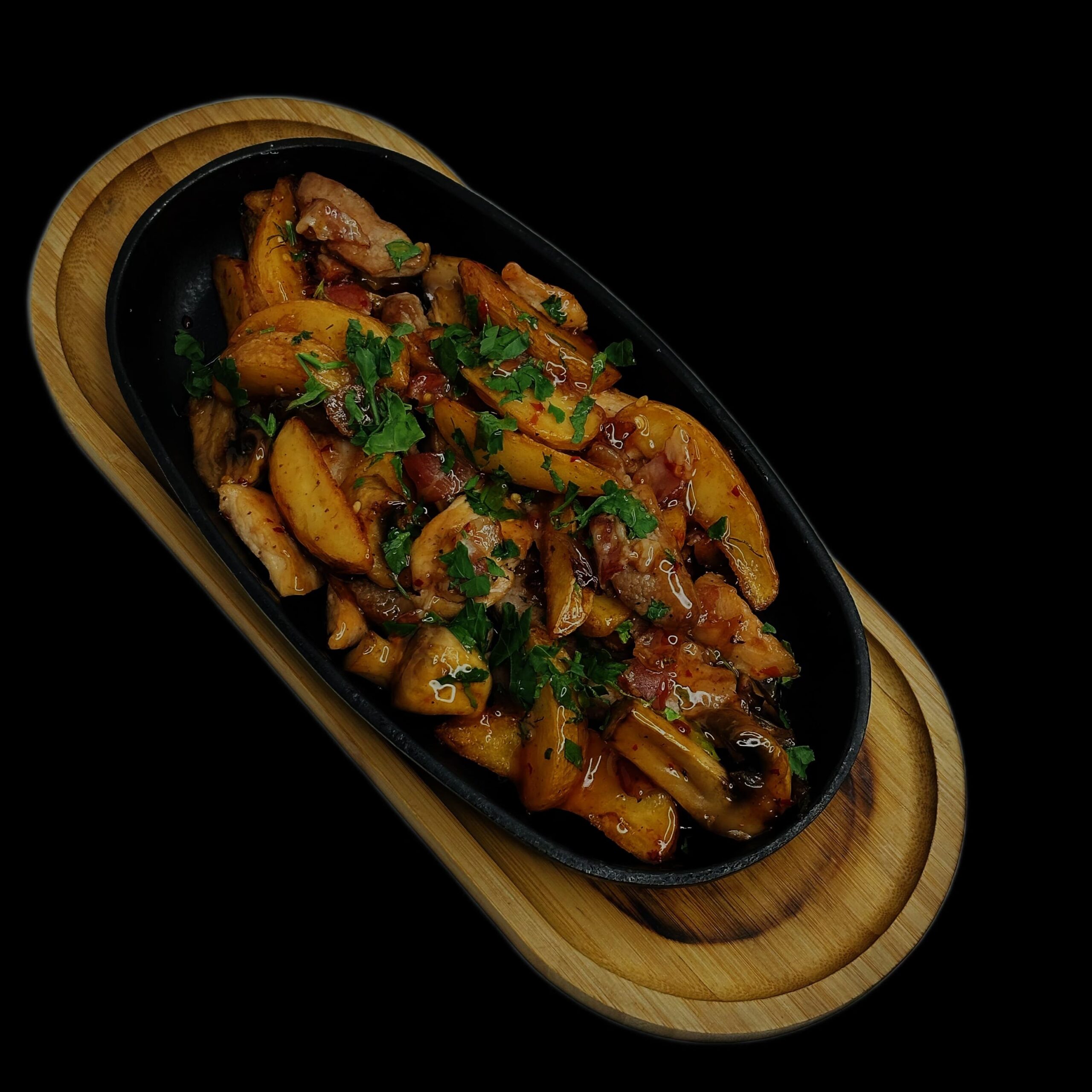 Сытное блюдо, сочетает в с | Больше Сытное блюдо, сочетает в себе филе свинины и курицы, обжаренные с беконом, луком и картофельными дольками в соусе свит-чили| Скрыть