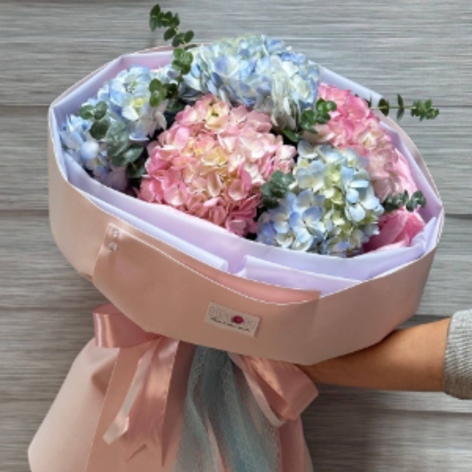 Букет с гортензией и эвкалиптом в оформлении