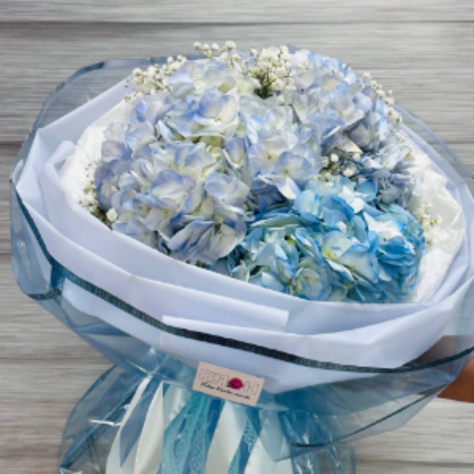 Букет с гортензией и гипсофилой в оформлении