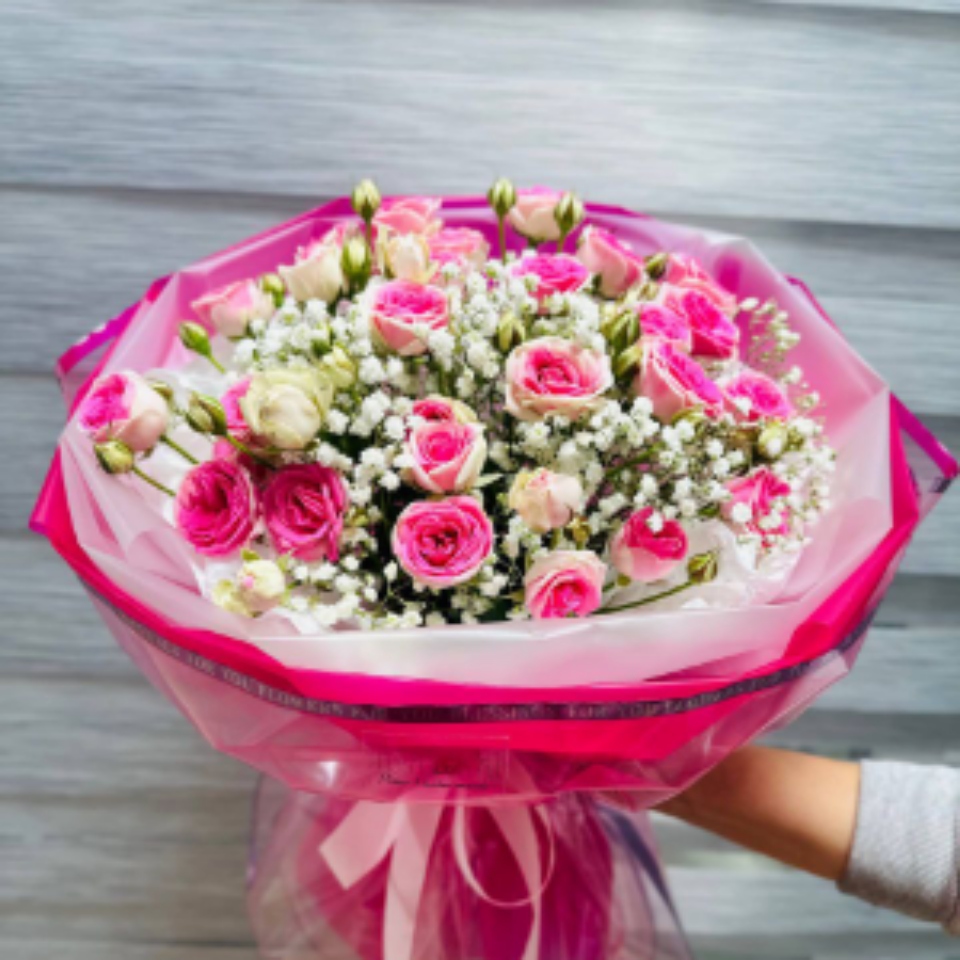 Букет с кустовой розы и гипсофилы в оформлении
