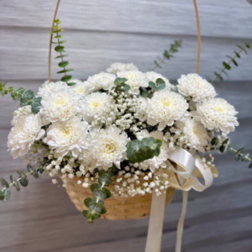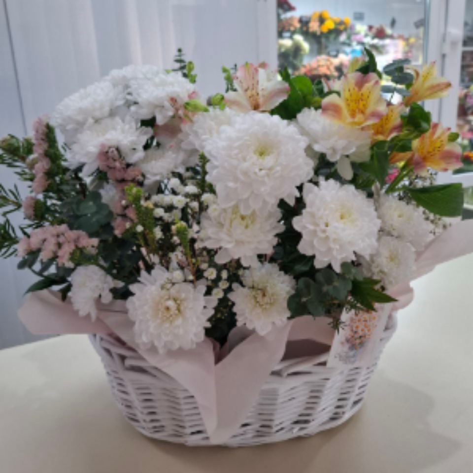 Корзина из хризантем с эвкалиптом