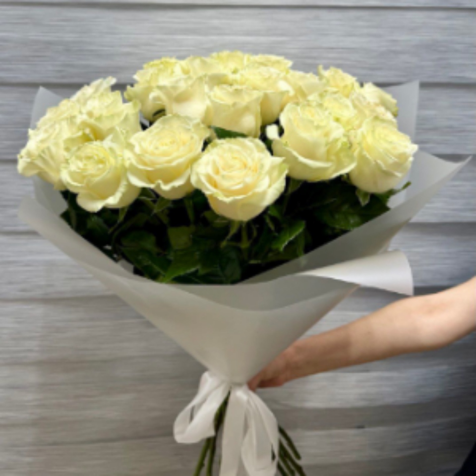 25 белых роз в оформлении