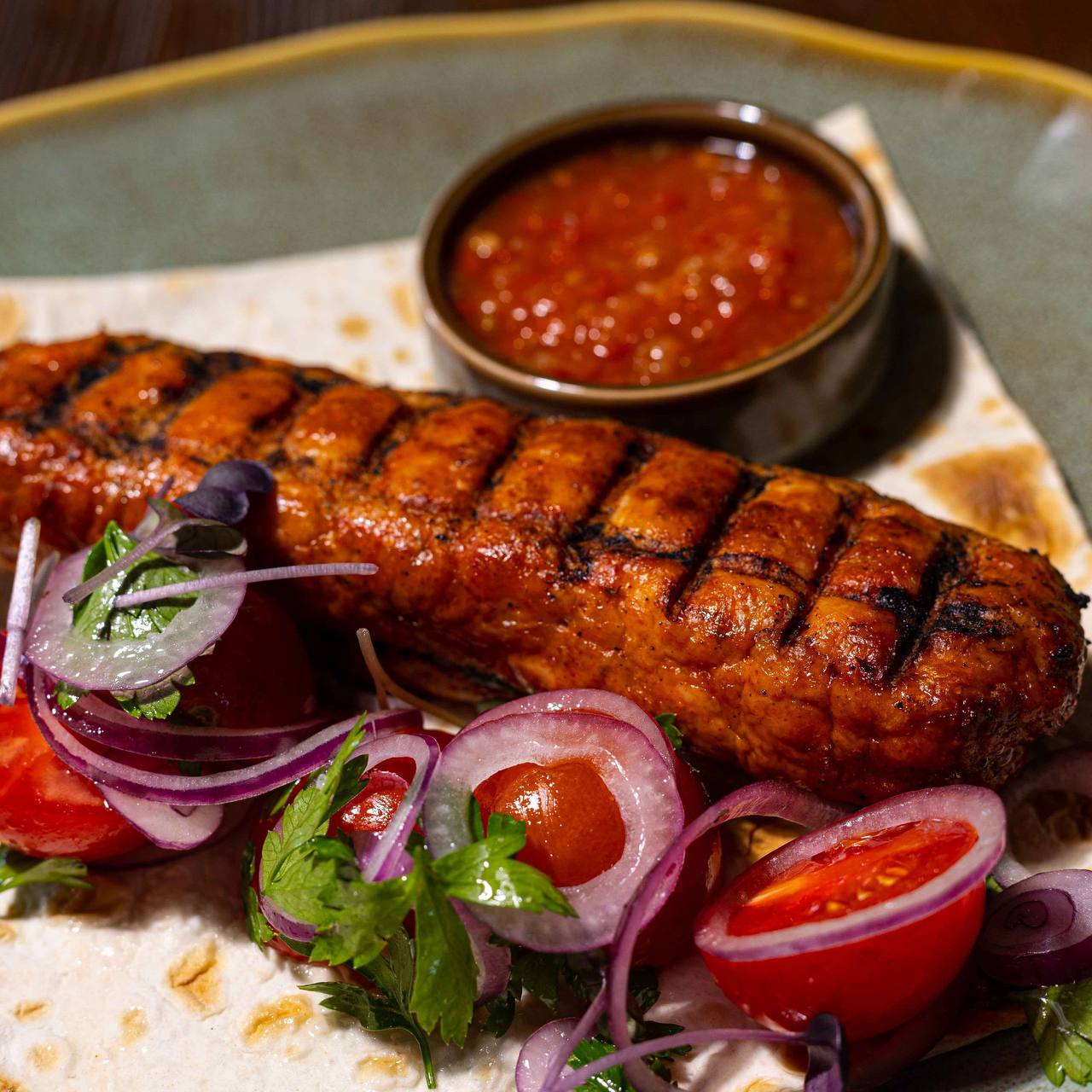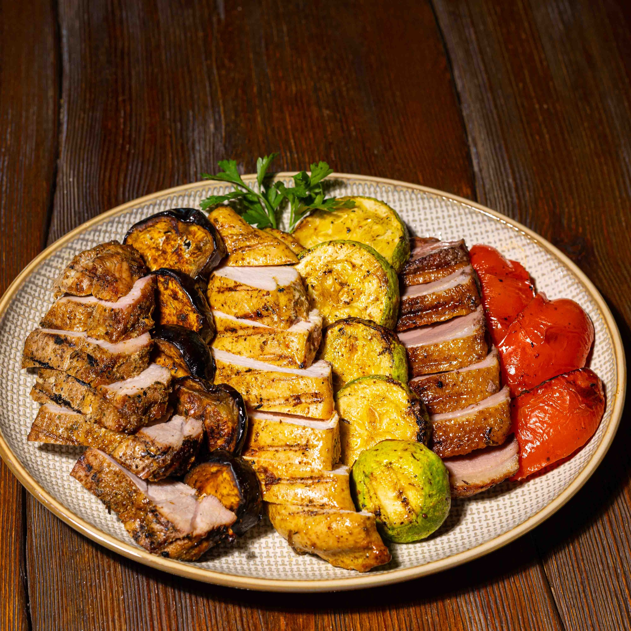 900/100г Свиной ошеек,куриное | Больше 900/100г Свиной ошеек,куриное филе,филе уктки,запечённые овощи,зелень,аджика| Скрыть