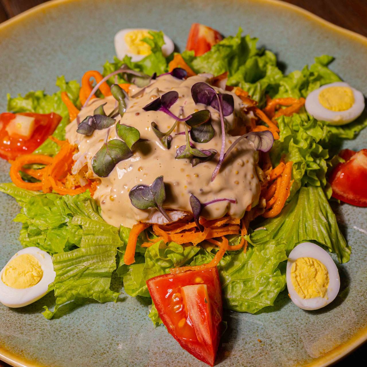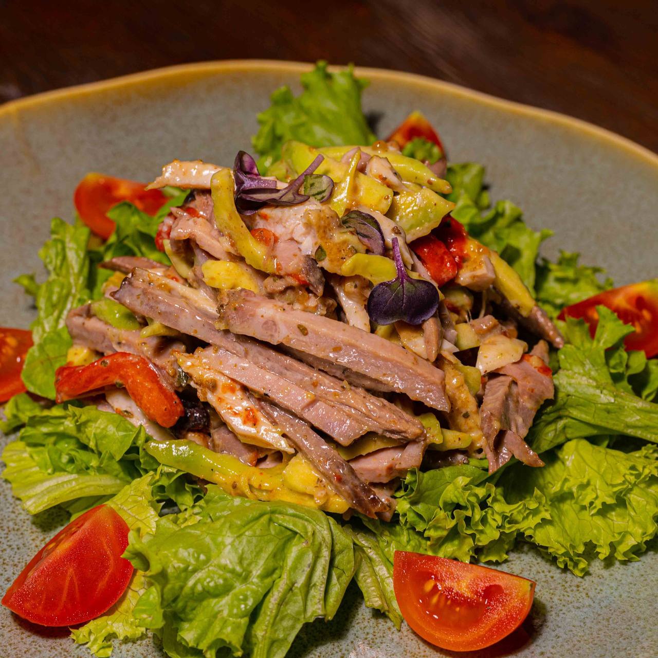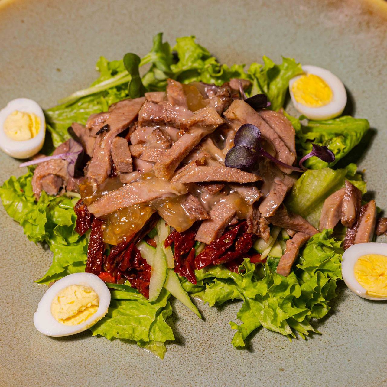 250г Язык говяжий, томаты вя | Больше 250г Язык говяжий, томаты вяленные, лист салата, яйца перепелиные, паприка запечённая, огурец свежий, горчичный соус| Скрыть