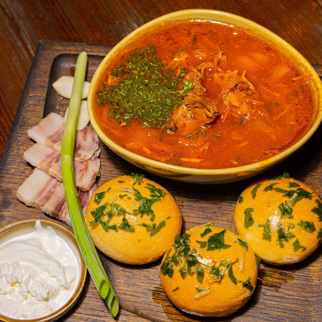 Борщ с пампушками и салом