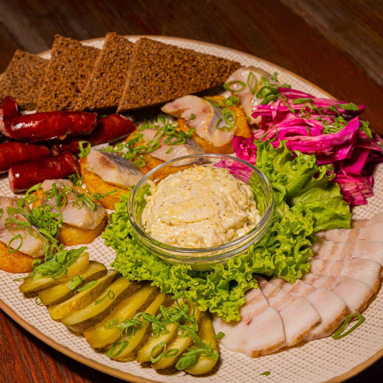 570г Сало солёное,колбаски � | Больше 570г Сало солёное,колбаски охотничьи,гренки из чёрного домашнего хлеба,канапе из сельди с картофелем,огурец солёный,капуста квашеная,чесночно-сырный крем| Скрыть
