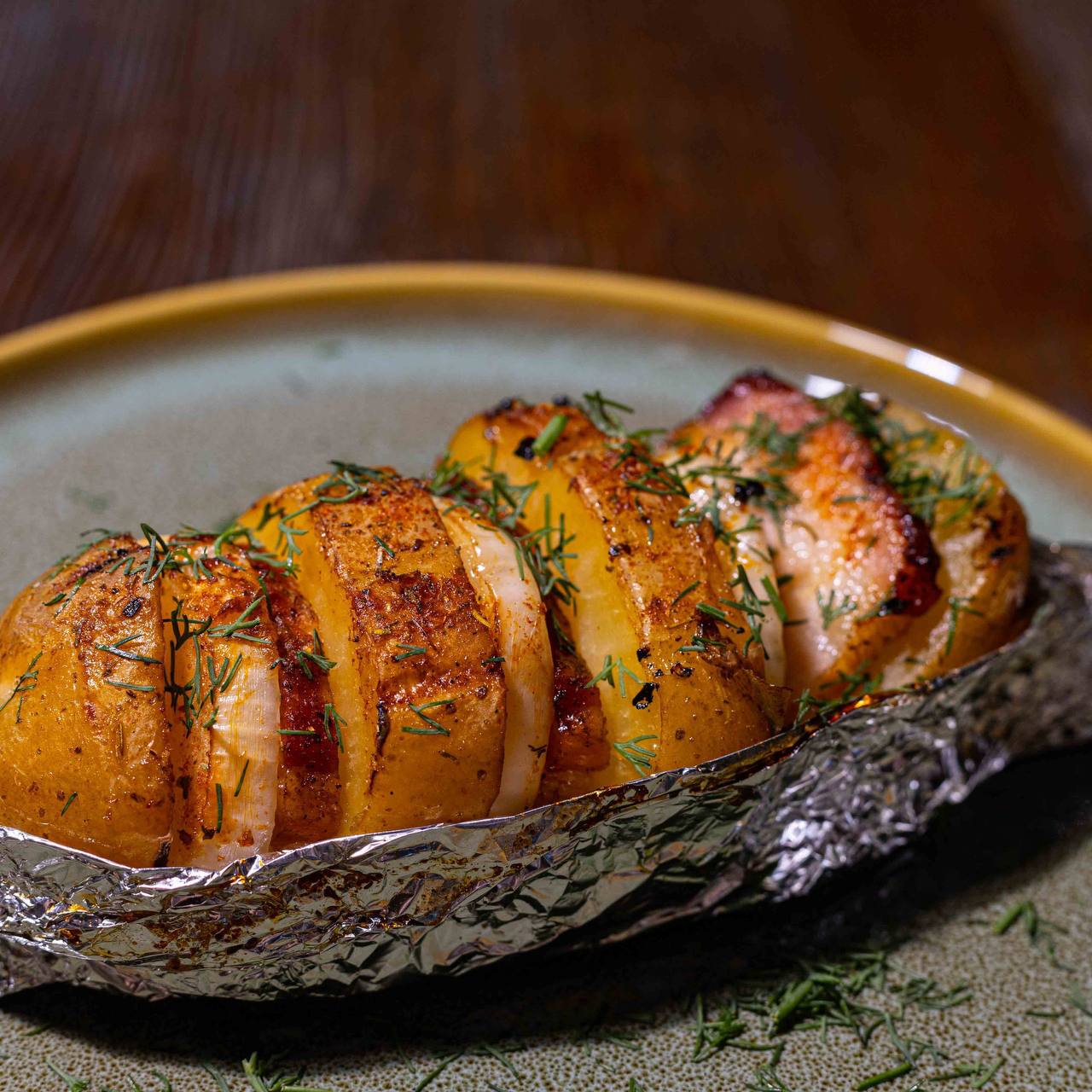 Картофель в фольге с беконом и луком